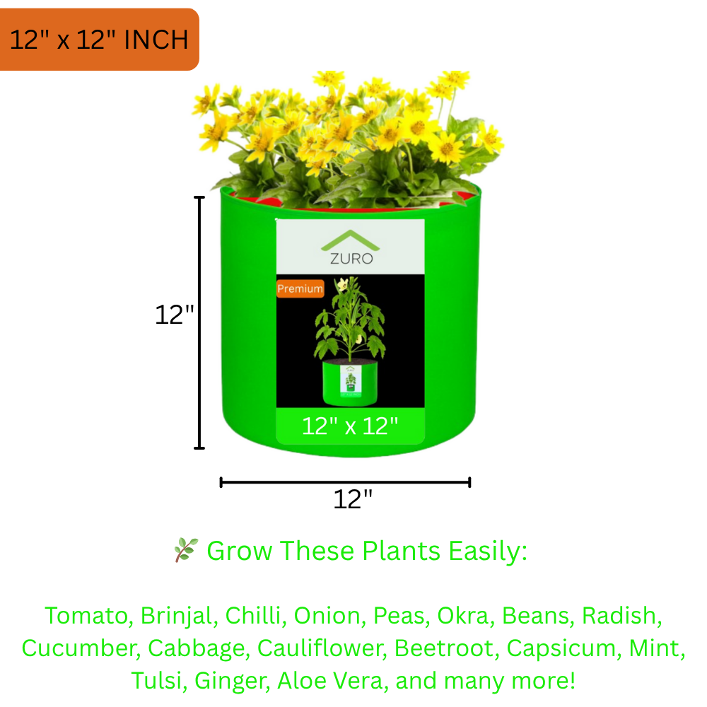 - 12×12 inches bag is suitable to grow Chilly, Brinjal, Tomato, Lady’s Finger, Cluster Beans, Lemon Grass, Radish, Beans, Agathi Leaves, Palak Spinach, Carrot, Cauliflower, Beetroot, Cabbage and Rose